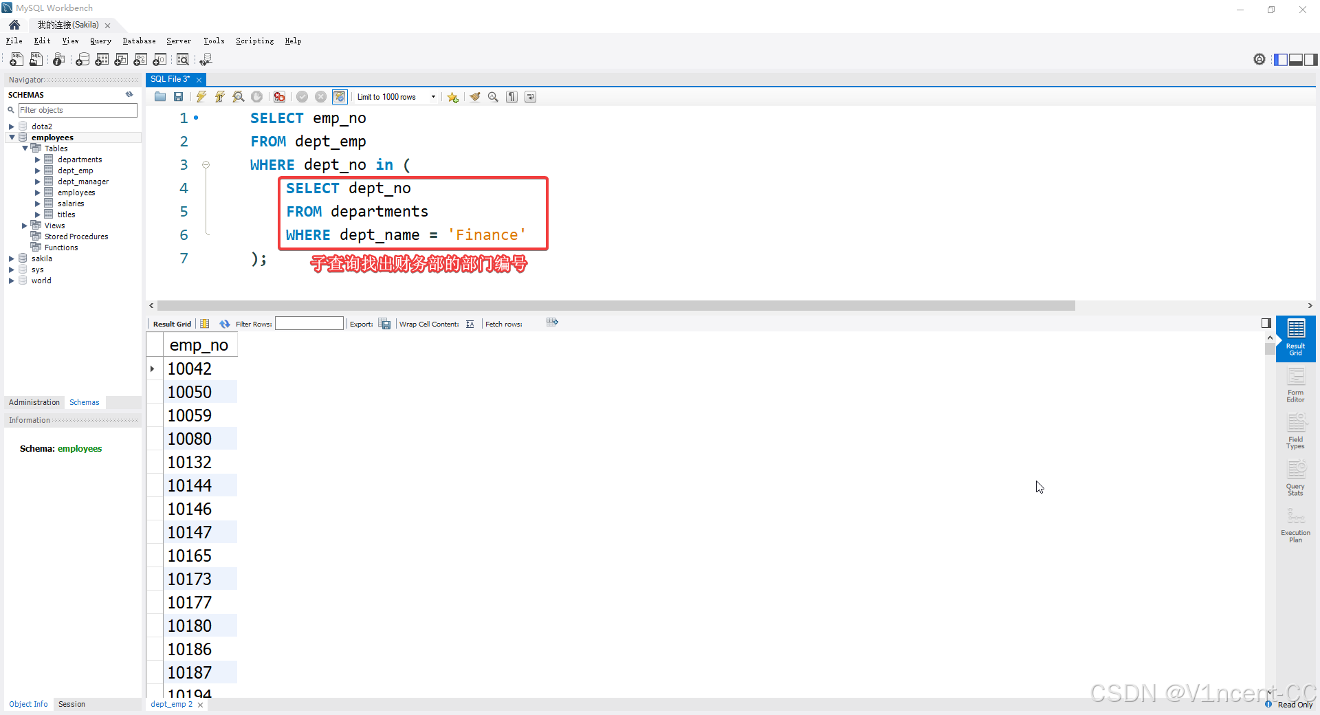 下面的SQL通过子查询先找出财务部对应的部门编号,然后将其作为where条件,过滤出员工号。