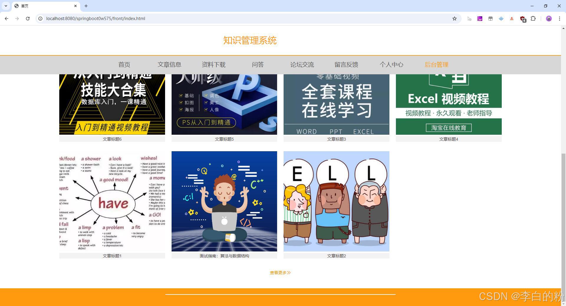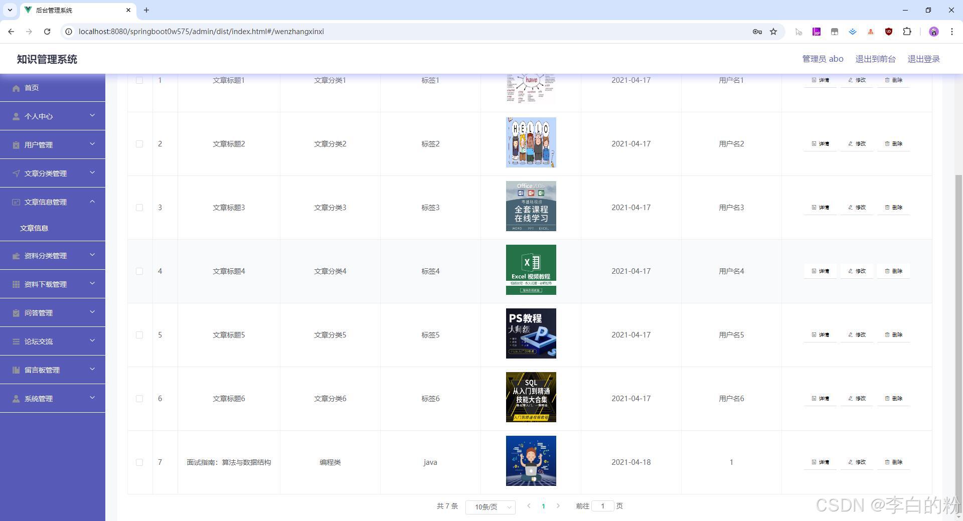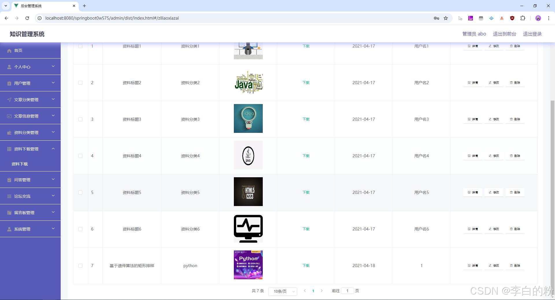 基于springboot的知识管理系统,前端采用html+vue,后端采用springboot+mybatis,系统采用MVC三层架构,角色:管理员、用户,系统功能齐全,代码简洁易懂,适合小白学编程...