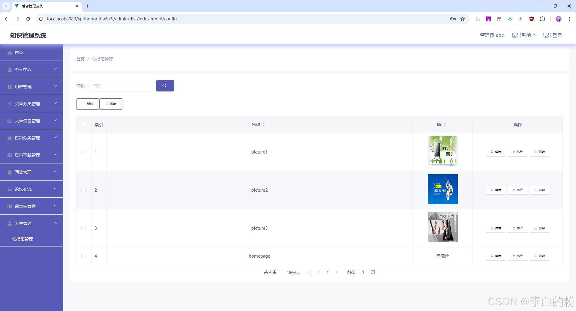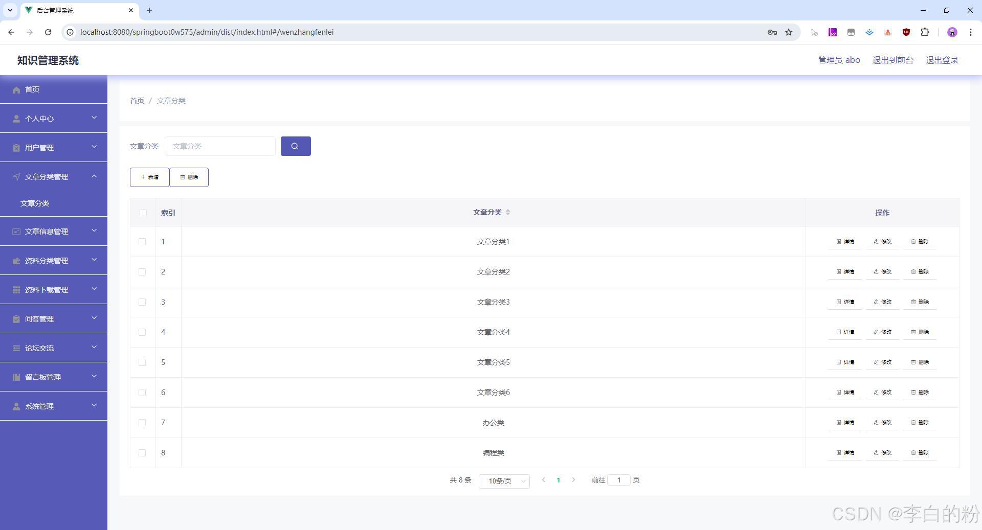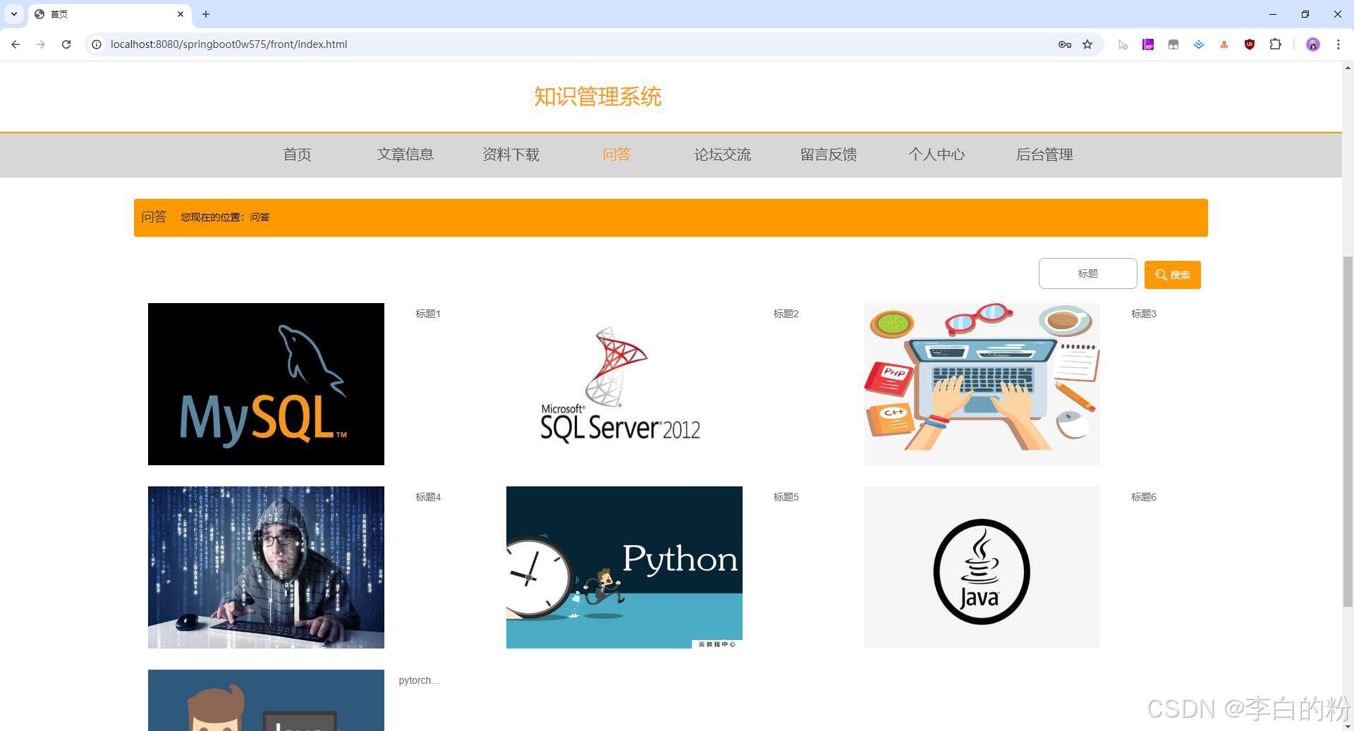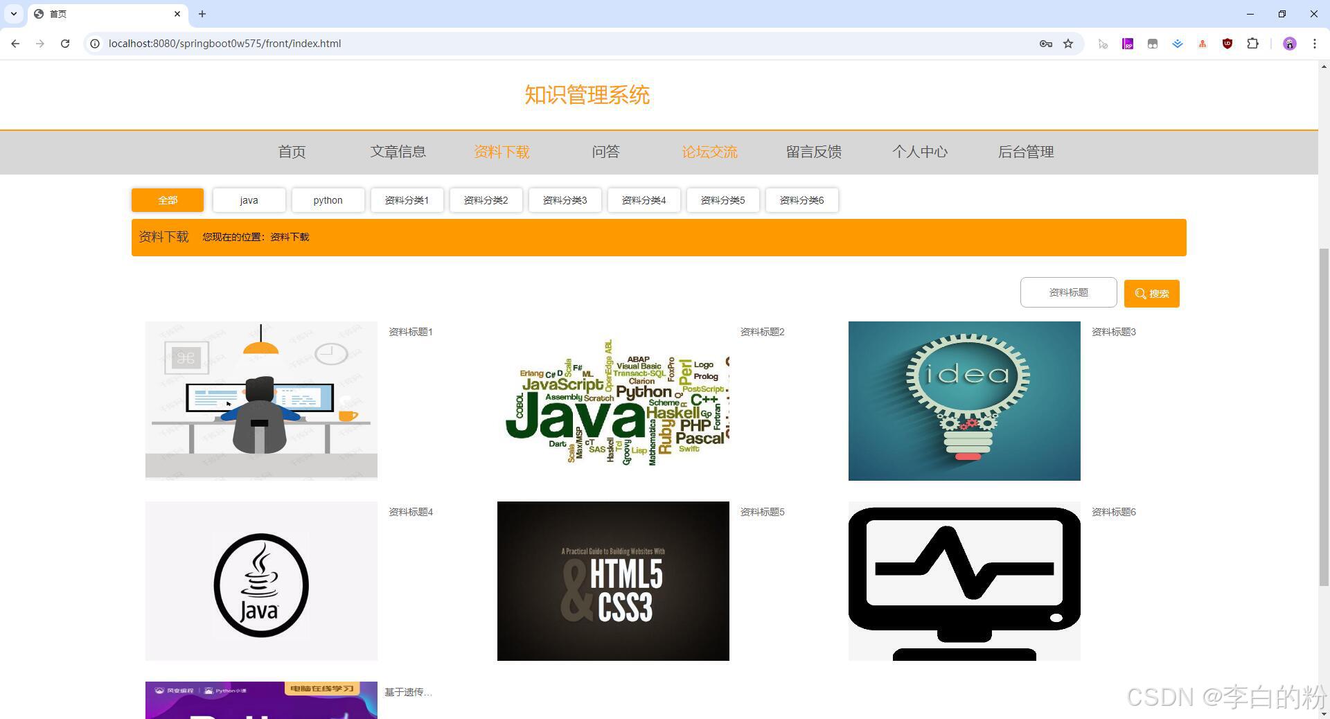 基于springboot的知识管理系统,前端采用html+vue,后端采用springboot+mybatis,系统采用MVC三层架构,角色:管理员、用户,系统功能齐全,代码简洁易懂,适合小白学编程...