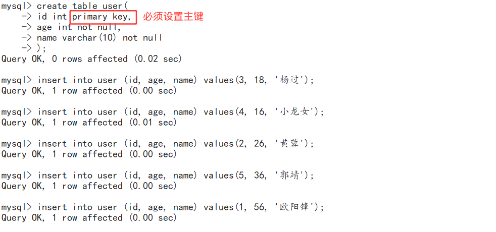 -- 在创建表的时候,直接在字段名后指定 primary key