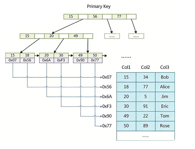 同样, InnoDB 除了主键索引,用户也会建立辅助(普通)索引,我们以上表中的 Col3 建立对应的辅助索引如下图:可以看到, InnoDB 的非主键索引中叶子节点并没有数据,而只有对应记录的key值。所以通过辅助(普通)索引,找到目标记录,需要两遍索引:首先检索辅助索引获得主键,然后用主键到主索引中检索获得记录。这种过程,就叫做回表查询。