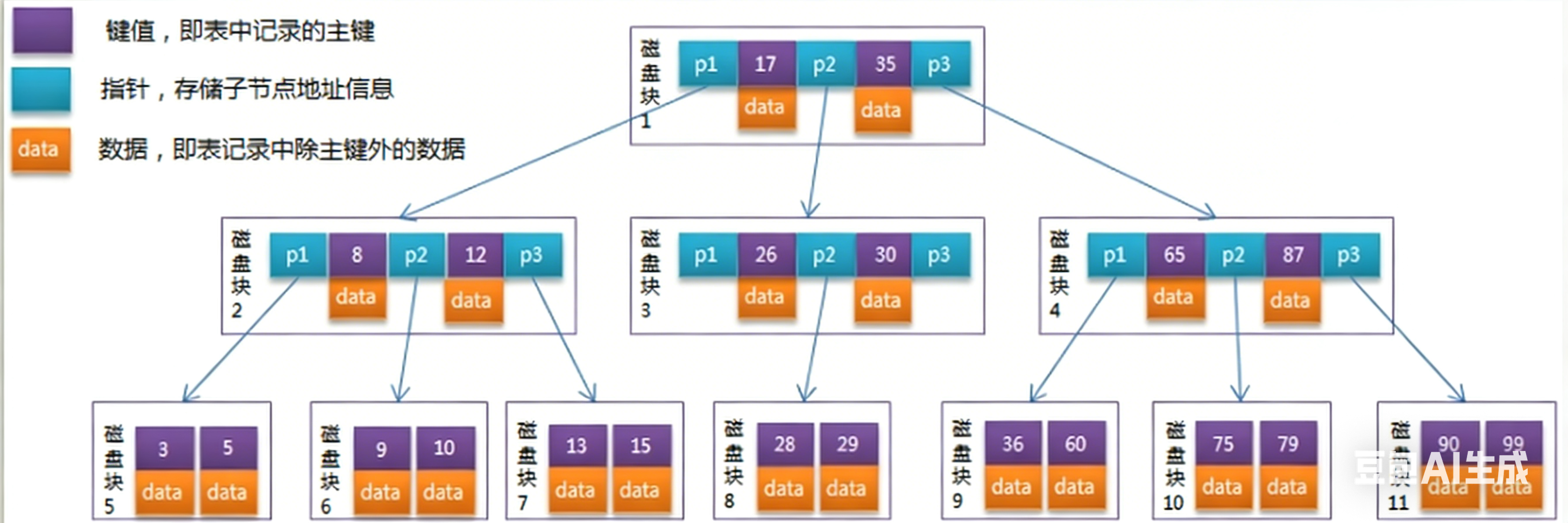 MyISAM 引擎同样使用B+树作为索引结果,叶节点的data域存放的是数据记录的地址。下图为 MyISAM