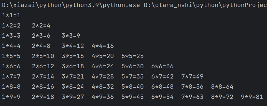 # 默认print换行,我们要做(九九乘法)表,所以用制表符