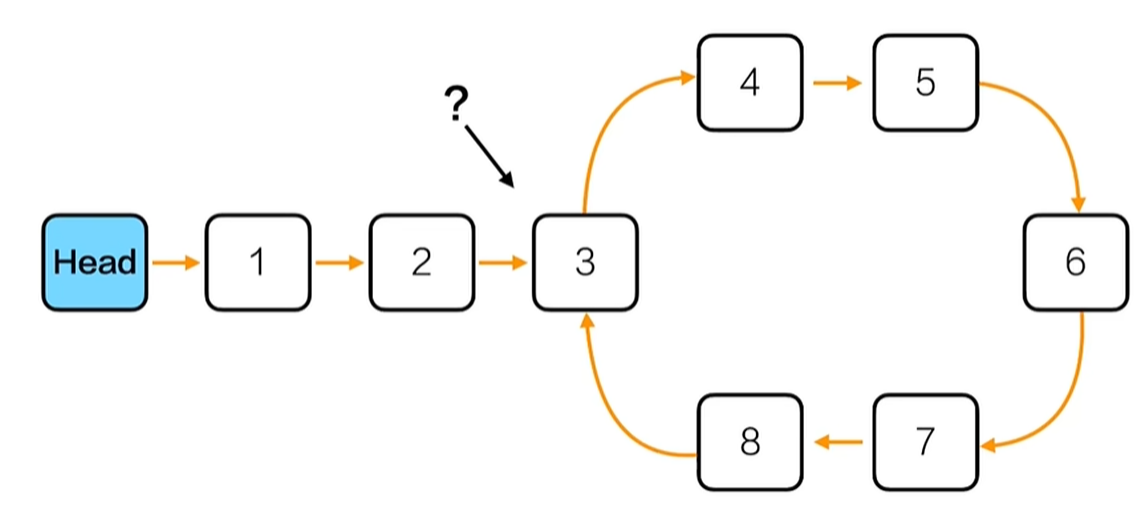 有环的链表,尾巴会指回前面某个节点,形成一个圈:1 → 2 → 3 → 4 → 5 → 6 → 回到 3这样永远走不到头,就是带环链表 。我们的目标:找到这个环的入口节点 (例子里是 3)。
