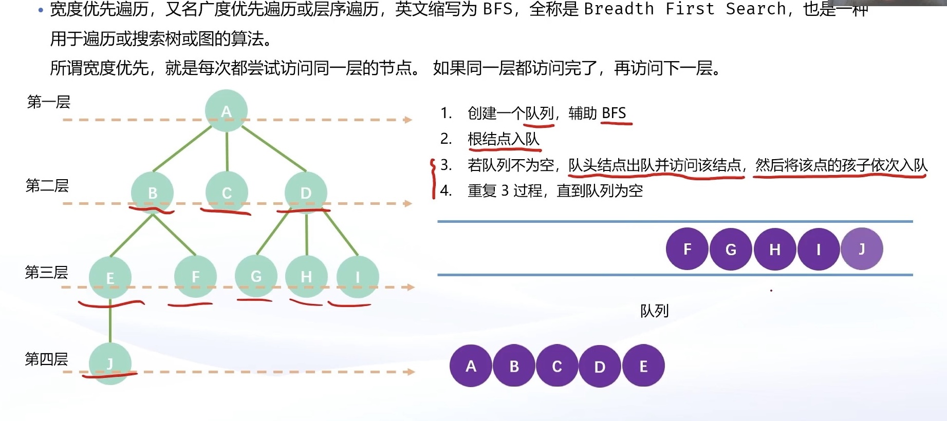 - 重复 3 过程,直到队列为空。