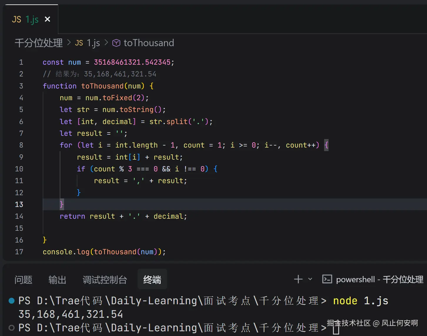 这个方法就像手工串珠子,从后往前把数字一个个拼回去,每拼 3 个就加个逗号 "隔档" ,逻辑特别直观,新手一看就能懂。遍历的时候用 count 计数,数到 3 就塞个逗号 ,还得注意 i !== 0 这个小细节 ------ 要是忘了这个,数字最开头会多一个逗号,面试就可能挂啦。