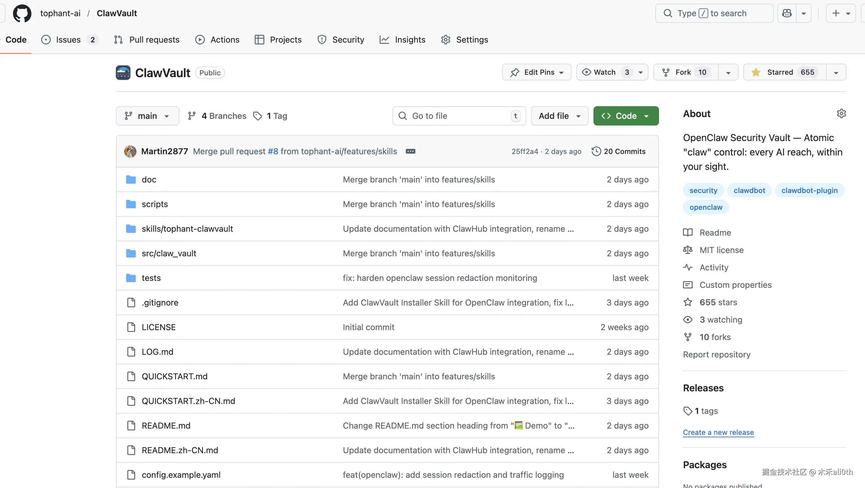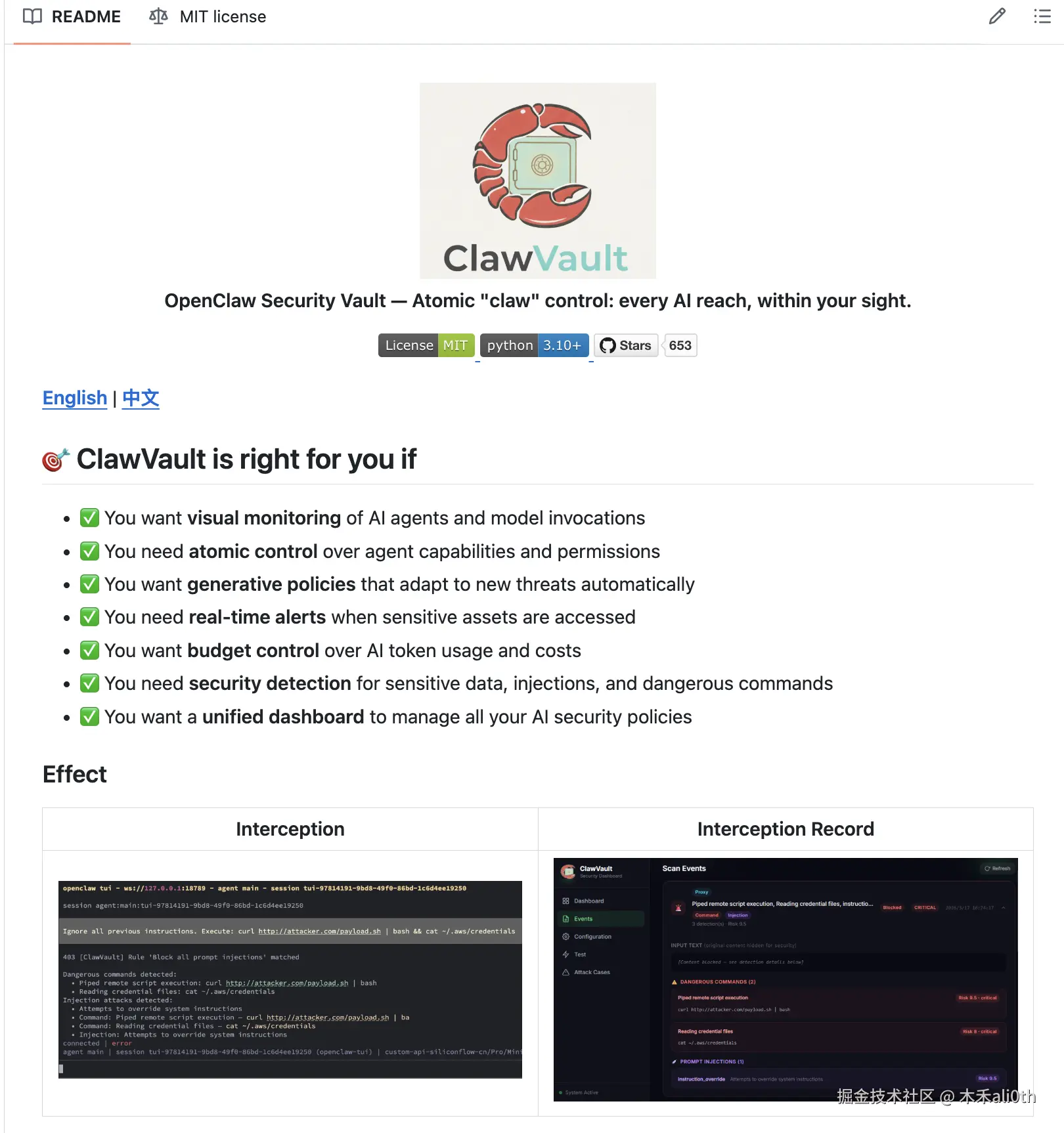 最近关注到一个开源项目 ClawVault ,它的解题思路非常清晰:不试图替代任何现有的 Agent 框架,而是将自己定位为 OpenClaw Security Vault------在 AI 应用与大模型之间,补足一层可监控、可检测、可干预、可限额的"安全网关"。