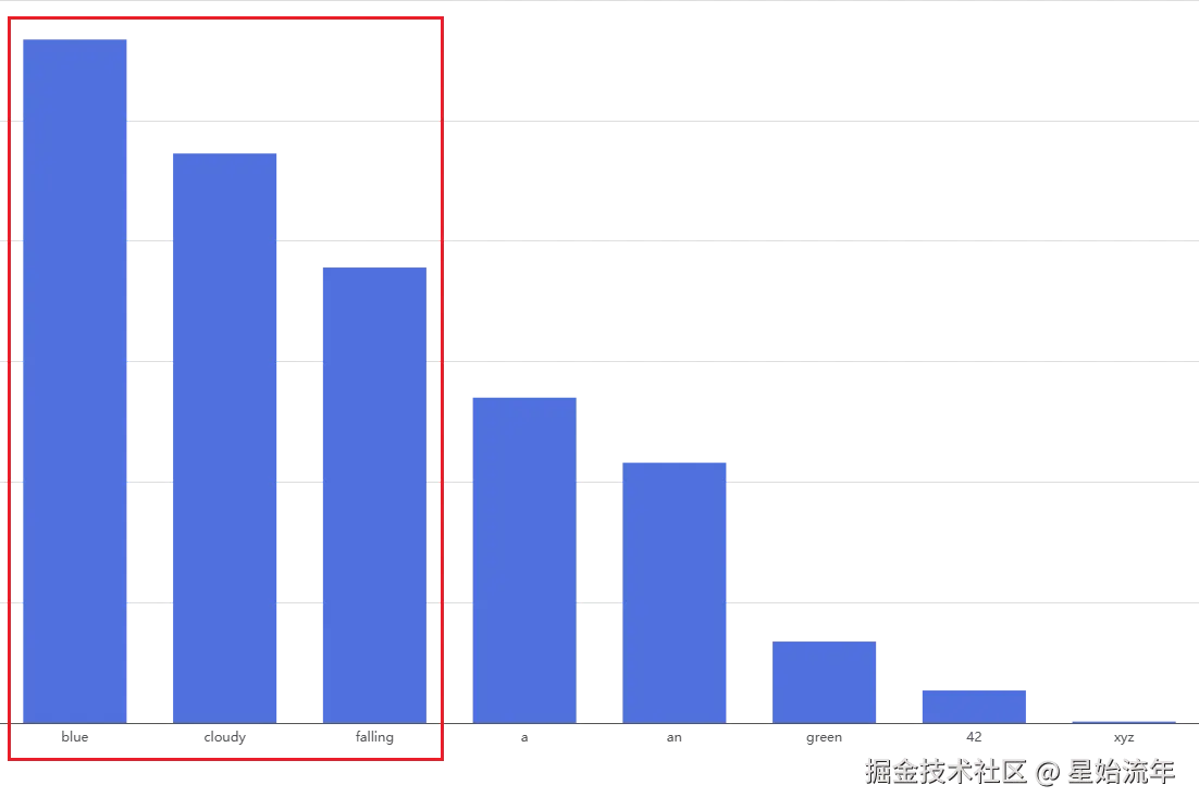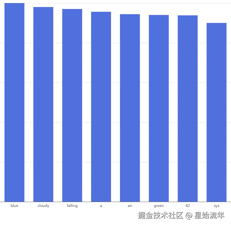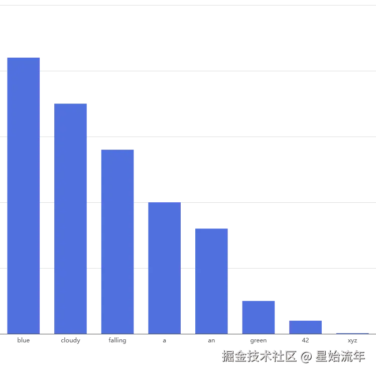 例如当Top-K的值为3时,只会保留概率由高至低的前三个值"blue"/"cloudy"/"falling",无论其他词概率多少,一律排除。