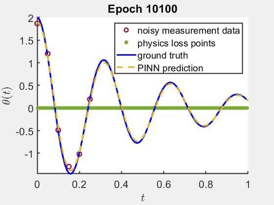 使用 Deep Learning Toolbox 中的 trainnet 函数训练的原始神经网络会对含噪声观测值产生过拟合,在 t 超出观测数据范围时预测性能显著下降。(请参阅 MATLAB 代码)