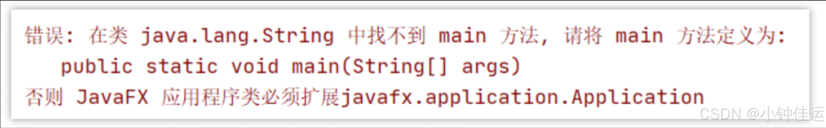 出现该信息是因为由双亲委派的机制,java.lang.String的在启动类加载器(Bootstrap classLoader)得到加载,因为在核心jre库中有其相同名字的类文件,但该类中并没有main方法。这样就能防止恶意篡改核心API库。