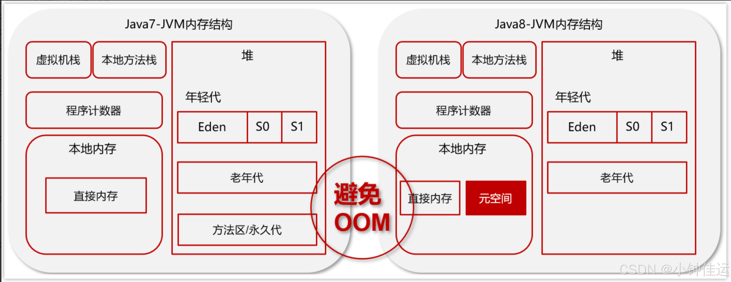 为了避免方法区出现OOM,所以在java8中将堆上的方法区【永久代】给移动到了本地内存上,重新开辟了一块空间,叫做元空间。那么现在就可以避免掉OOM(堆内存溢出)的出现了。