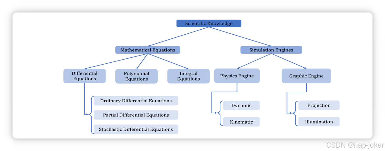 科学知识通常以方程表示,如微分方程。另一个重要因素科学知识的代表工具是模拟。仿真模拟现实世界的物理系统,被视为支配现实世界物理系统的物理原理的替代表现。我们在图2中可视化了科学知识及其表征的分类法。