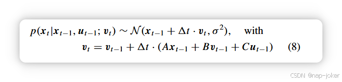 其中u为给定的执行。为了将上述动态方程纳入变分自编码器(VAE),位置 x 被视为随机变量,速度 v 为中间变量。具体来说,速度计算为vt = ((x − xt−1)/1t),时间间隔为1t。给定ut的条件分布xt现在变为: