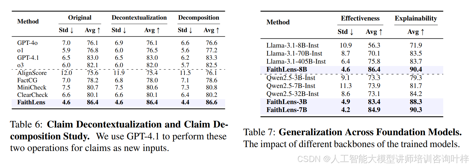 值得一提的是,FaithLens 的泛化能力极强,表 7显示无论是基于 Llama-3.1 还是 Qwen2.5 系列模型作为基座,经过它的训练流程后,性能都能显著提升。而且不需要对主张进行去语境化处理(表 6),模型自身就能捕捉上下文依赖关系,若配合主张分解将复杂主张拆分为原子事实,还能进一步提升检测精度。