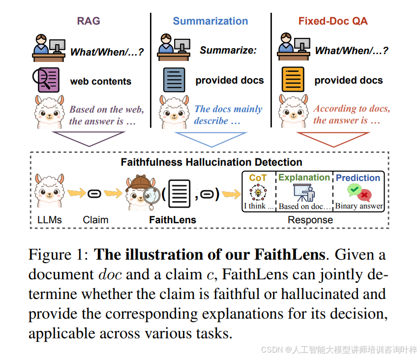 FaithLens 的核心逻辑很明确:先通过高质量数据训练打好基础,再用强化学习优化性能和解释质量。图 1展示了它的工作流程 ------ 给定文档和大模型生成的主张,模型不仅能给出 "忠实" 或 "幻觉" 的二分类结果,还能附上详细解释,适配摘要、RAG、固定文档问答等多种任务。