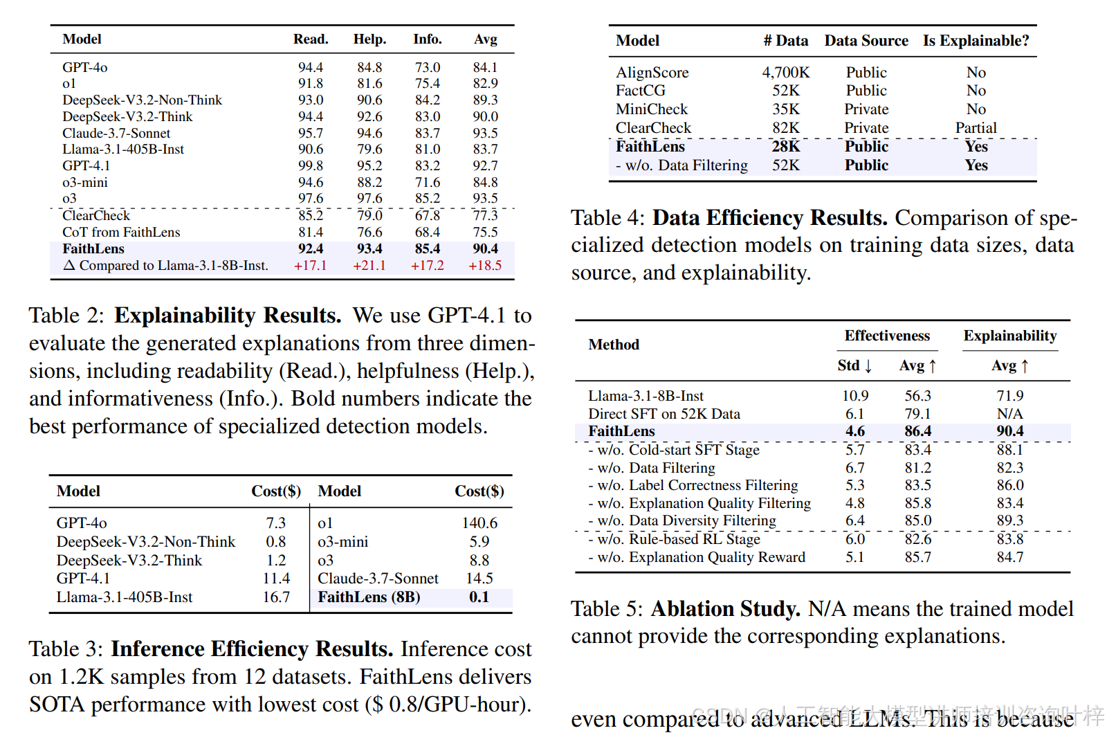 效率方面更是 FaithLens 的强项,表 3显示它处理 1.2K 样本的推理成本仅 0.1 美元,远低于 GPT-4o 的 7.3 美元和 GPT-4.1 的 11.4 美元,表 4还证明它只用 28K 公开数据,就能实现比依赖私有数据的模型更优的效果,数据利用率极高。消融实验(表 5)进一步验证了各组件的必要性:去掉数据过滤会让效果下降 5.2 个百分点,缺少强化学习阶段则会损失 3.8 个百分点,解释质量奖励对提升解释可读性和帮助性至关重要。