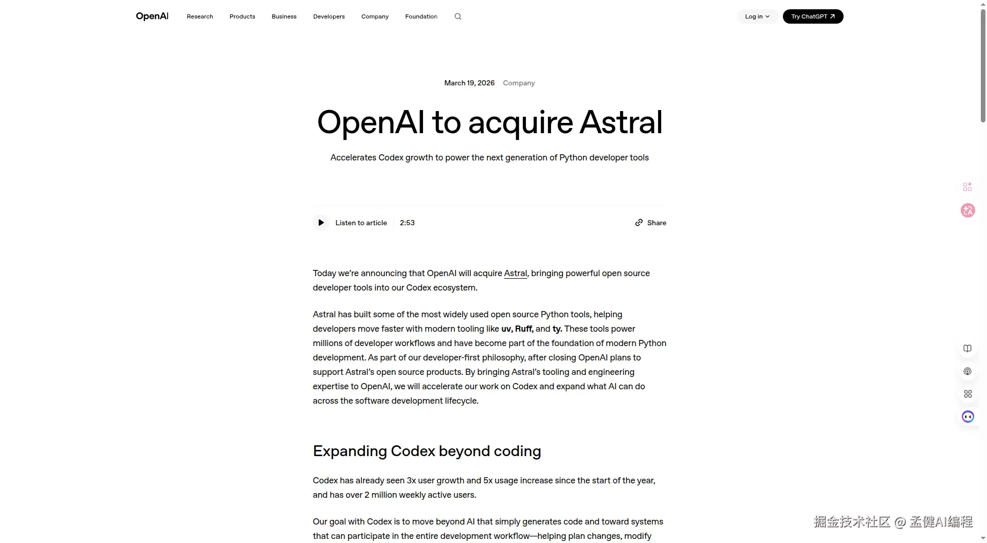 Ars Technica 的报道标题也很直接:「OpenAI 正在收购开源 Python 工具制造商 Astral。」------言下之意,这不是买一个产品,是买一个生态位。