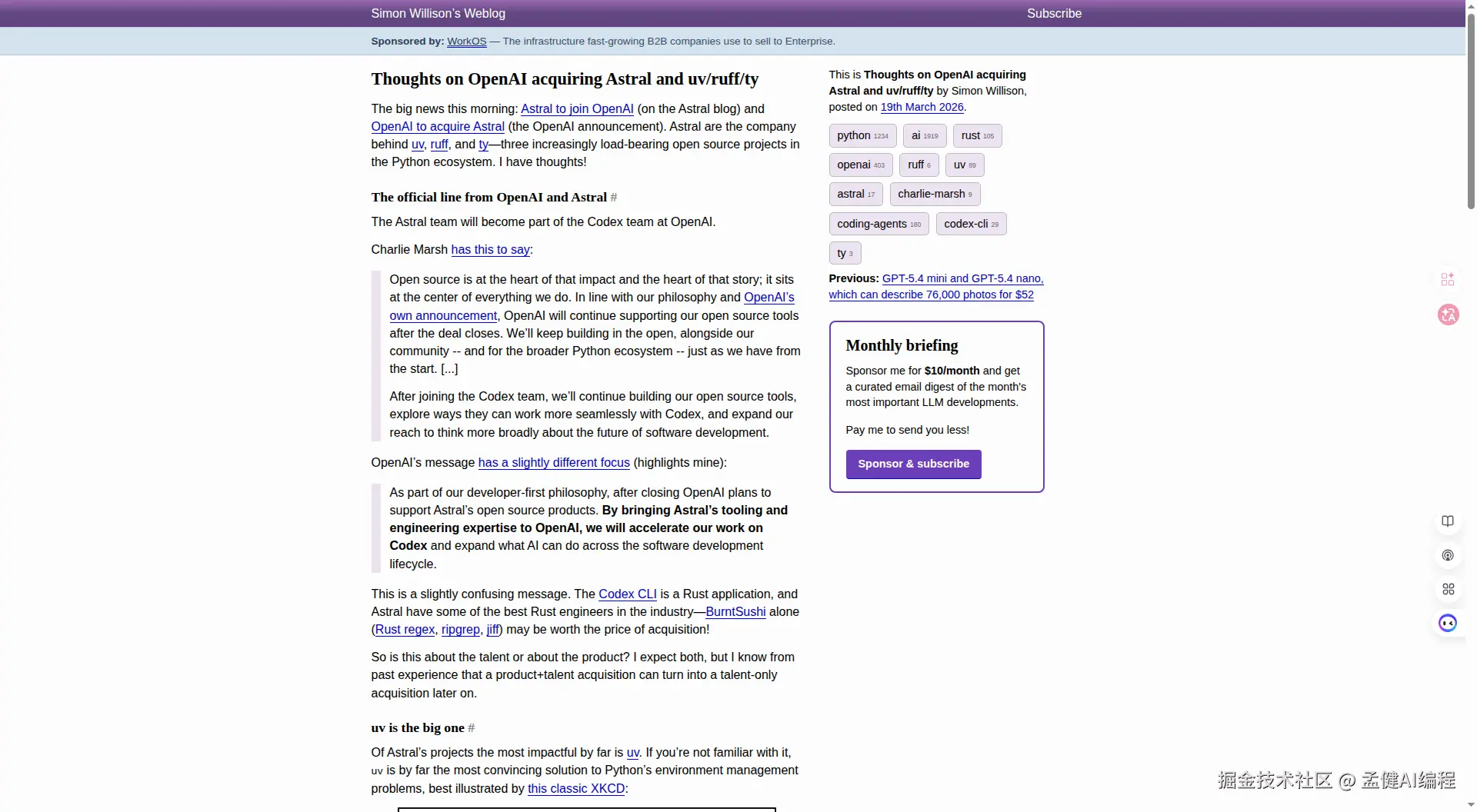 OpenAI 昨天宣布收购 Astral------就是做 uv、Ruff、ty 的那家公司。如果你写 Python,这三个工具你大概率已经在用了。