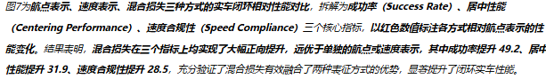 Hybrid Loss在实车闭环测试中实现了全指标提升,如图7所示,相比单一的Waypoint或Velocity表示,Hybrid Loss在成功率、车道居中性能、速度合规性三大核心闭环指标上均有显著提升,其中成功率提升49.2%,成为模型实现实车稳定闭环的关键设计。