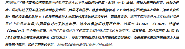 Hybrid Loss的核心设计是:模型仍输出速度序列(保证数值稳定性),训练时同时施加速度监督和积分后的航点监督,既约束局部速度的平顺性,又约束全局轨迹的几何形状。