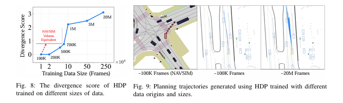只有在足够大的真实数据规模下,扩散模型的多模态能力才能被充分激发,而这一能力在现有基准数据集的规模下难以体现。HDP的设计摒弃了强先验,让模型的能力完全由数据驱动,这一特性使其具备工业化大规模部署的潜力------随着自动驾驶路测数据的持续积累,HDP的性能将持续提升,而无需对模型结构进行大幅修改。