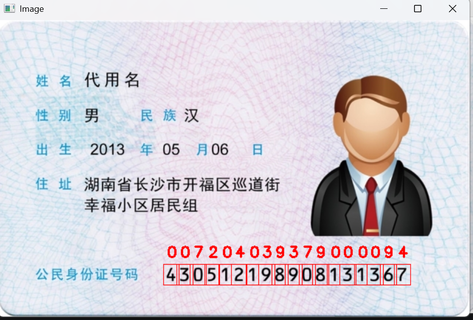 在原图上绘制识别结果,并输出完整的身份证号码。