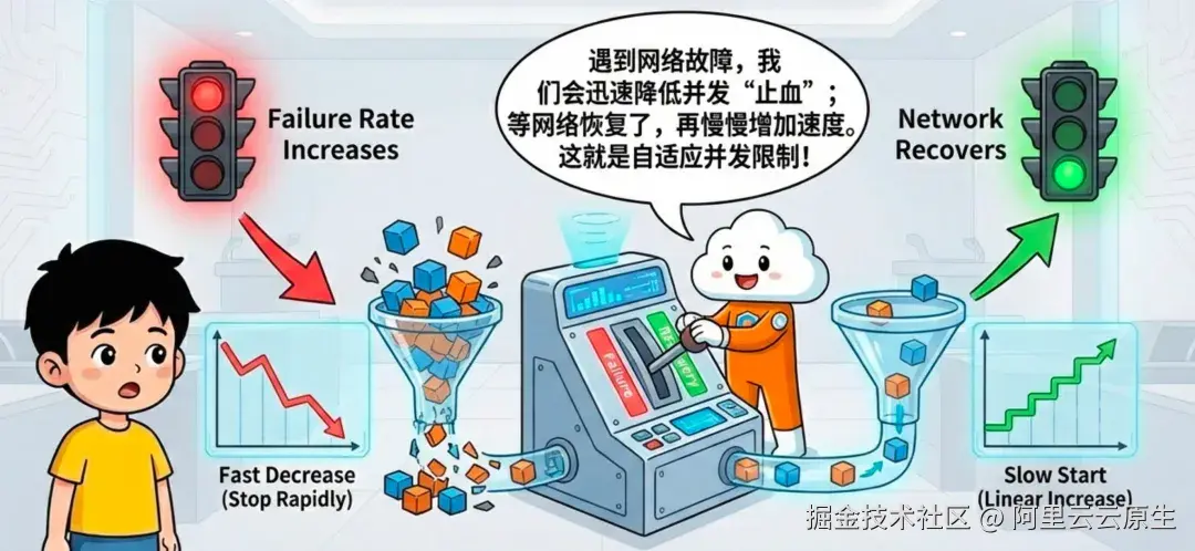 3)故障隔离:自愈网络弹性(AIMD 自适应并发限制)