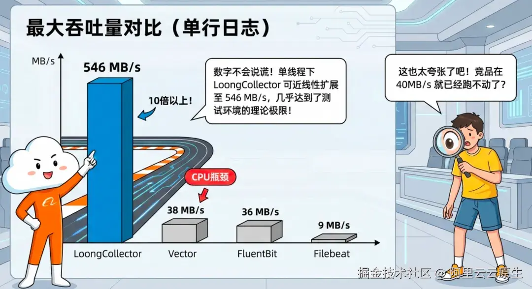 对比中我们也观察到"拐点":不少方案在约 40 MB/s 时已接近 CPU 饱和,而 LoongCollector 在单线程下仍可近线性扩展至 546 MB/s(测试环境理论上限附近)。