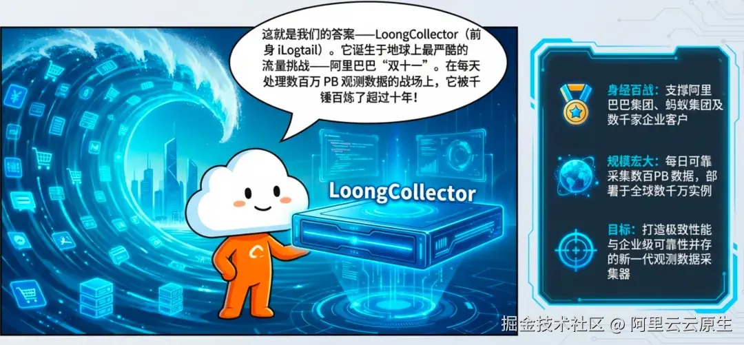 如今 LoongCollector 以千万级的装机量部署在在阿里、蚂蚁及数万家企业客户环境中,每天稳定采集百 PB 级可观测数据,覆盖日志与指标等场景,构建了云上统一采集层。