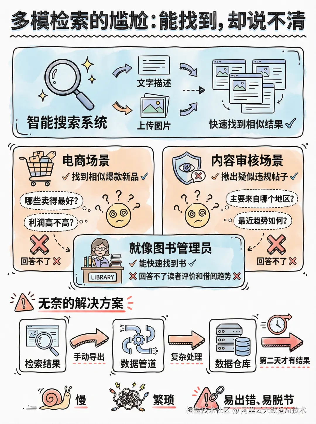 这就是当前多模检索面临的尴尬:系统能"找到东西",却回答不了"这些东西意味着什么"。 它像个高效的图书管理员,能瞬间从书架上抽出你要的几本书,但当你问他"这几本书的读者评价怎么样?"或者"这类书最近借阅量有变化吗?",他就只能摇头了。