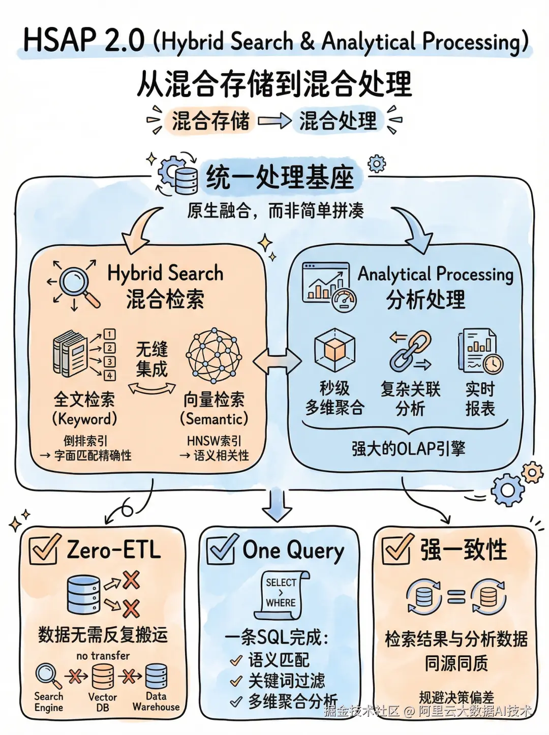 Hologres 提出的 HSAP 2.0 (Hybrid Search & Analytical Processing) 架构,就是要彻底解决这个痛点。它的核心思想很简单:别再让检索和分析分家了! 我们要把强大的实时分析能力(OLAP)直接内置到检索引擎里。这样,当你找到那批"最像"的结果时,系统不仅能告诉你"它们是什么",还能立刻告诉你"它们表现如何"、"趋势怎样"、"跟其他业务数据有什么关联"。从此,检索系统不再只是一个"查找工具",而是升级为一个能直接驱动商业决策的"洞察引擎"。