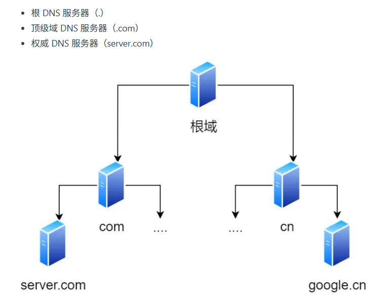 - DNS解析:如果缓存未命中,浏览器向本地 DNS 服务器发起请求,最终可能通过根域名服务器、顶级域名服务器(.com)、权威域名服务器逐级查询,直到获取目标域名的 IP 地址。