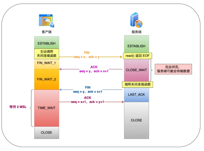接着,当服务端在 read 数据的时候,最后自然就会读到 EOF,接着 read() 就会返回 0,这时服务端应用程序如果有数据要发送的话,就发完数据后才调用关闭连接的函数,如果服务端应用程序没有数据要发送的话,可以直接调用关闭连接的函数,这时服务端就会发一个 FIN 包,这个 FIN 报文代表服务端不会再发送数据了,之后处于 LAST_ACK 状态;