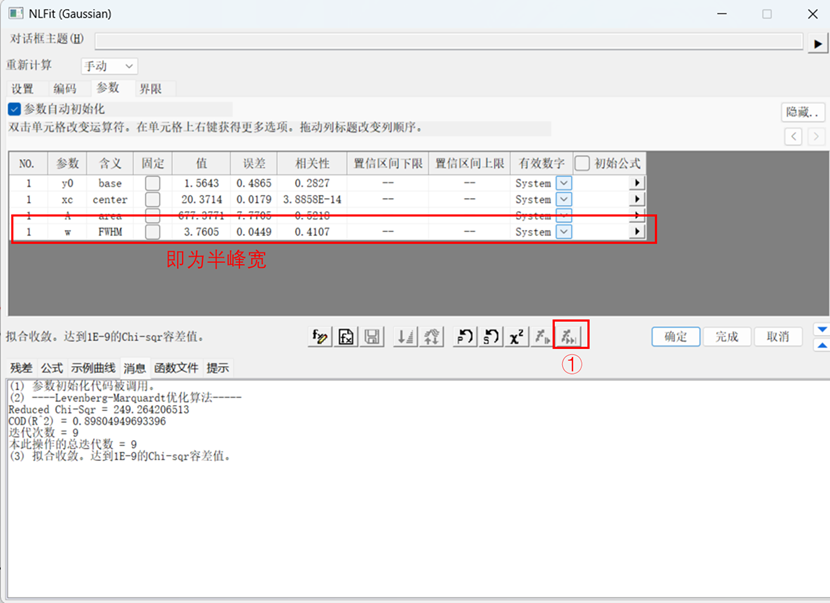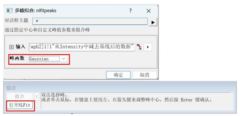 峰函数选择为Gaussian,在跳出的对话框,点击打开NLFit;