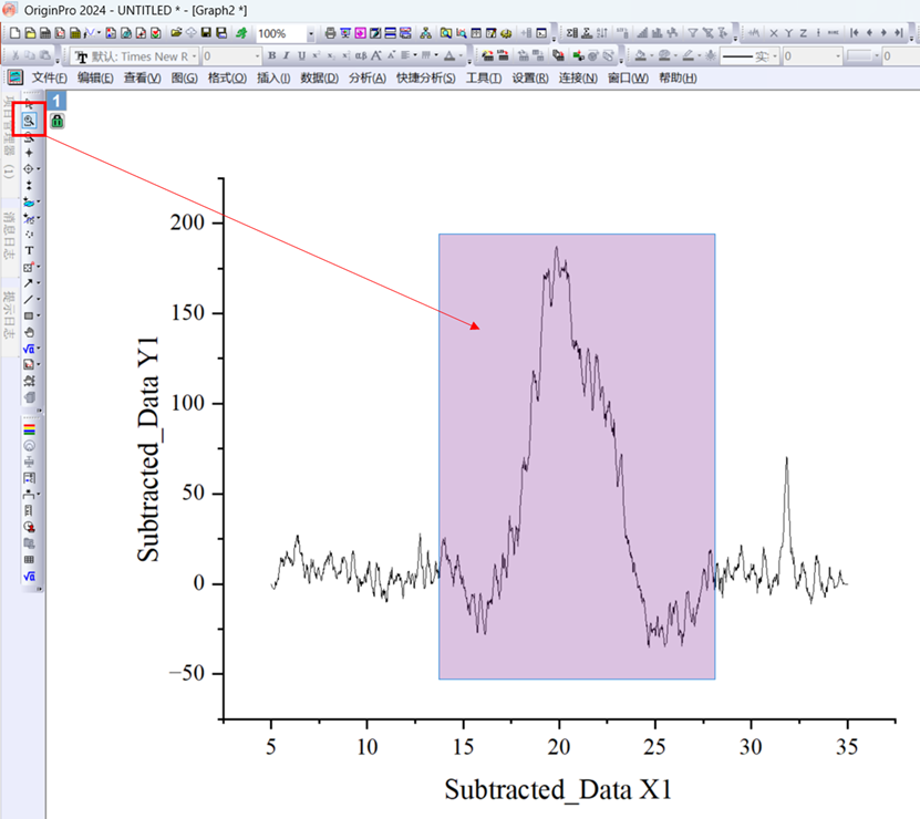 7.点击放大镜,放大需要计算半峰宽的峰,这里以最大峰为例;