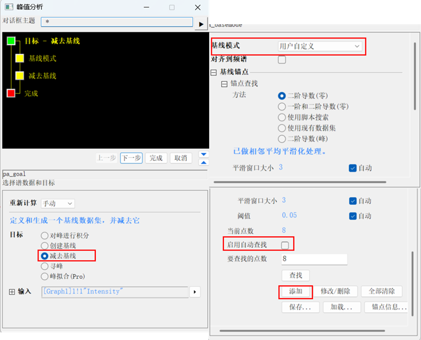 在跳出的对话框,选择减去基线,点击下一步,在基线模式选择用户自定义,取消勾选自动查找,然后点击添加,依次添加基线点,点击完成;