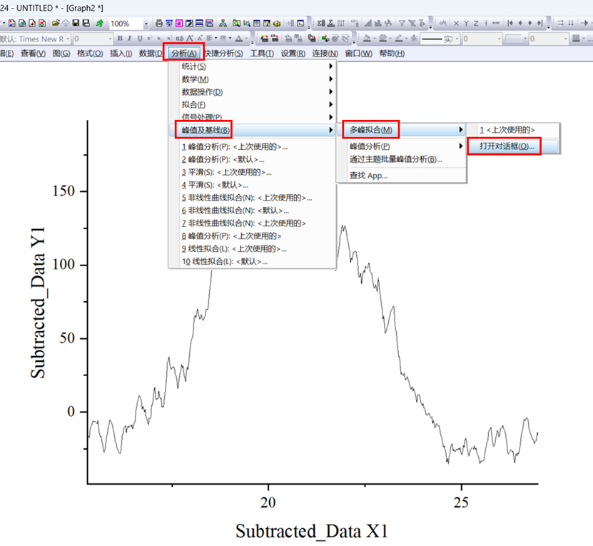 8.点击分析---峰值及基线---多峰拟合---打开对话框;