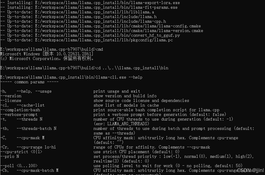 解压llama.cpp,在解压文件中创建一个build目录,进入build目录执行cmake命令,进行配置,接着执行make命令进行编译,之后进行make install 进行安装。整个过程我整合成一个bat文件,双击即可执行对应流程。