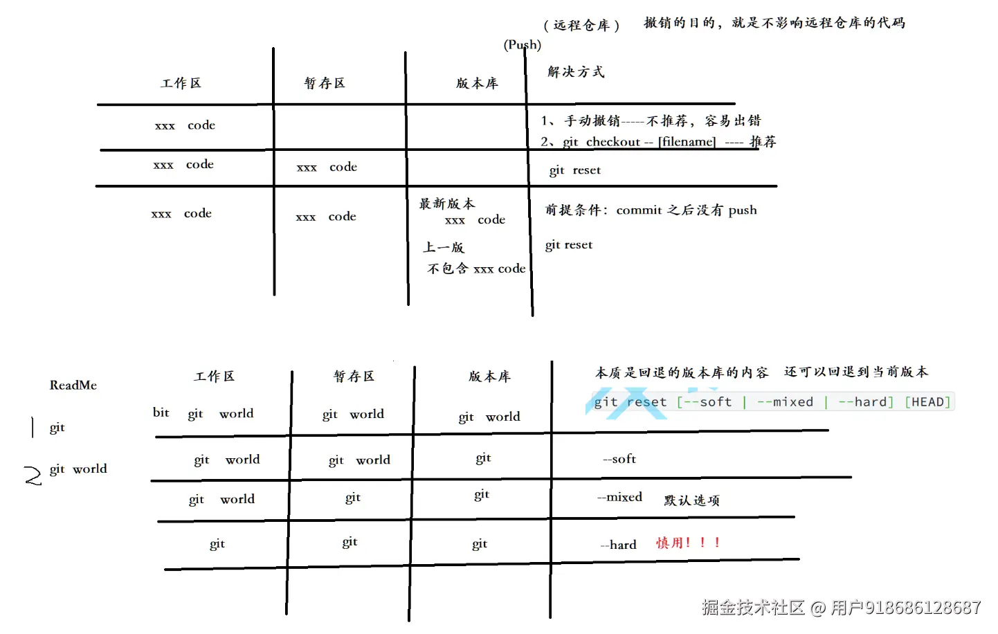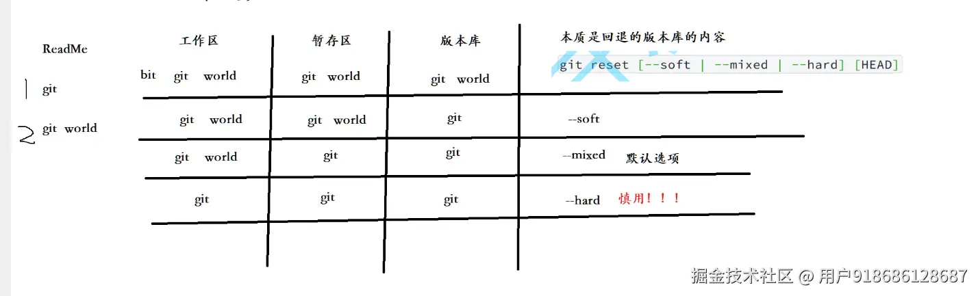 --soft: 只移动 HEAD 指针,不改变暂存区和工作区--mixed(默认): 移动 HEAD 指针并重置暂存区,但不改变工作区--hard: 彻底回退,移动 HEAD 指针、重置暂存区和工作区