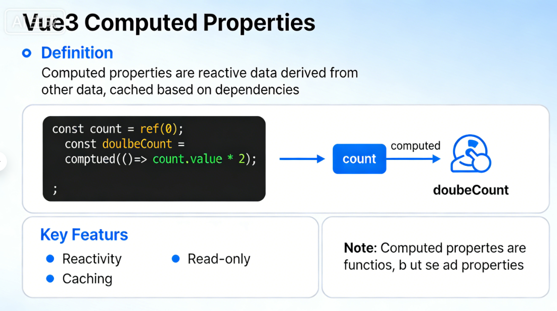 computed 是 Vue3 核心的响应式计算属性 ,核心作用是:基于依赖的响应式数据自动计算出新值,且自带缓存(依赖不变,计算结果不会重复计算),比普通方法性能更高。