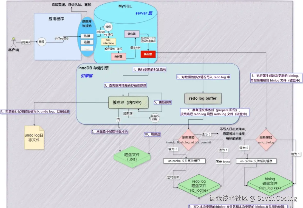 - 这个时候Update语句完成了Buffer Pool中数据页的修改、Undo Log、Redo Log缓存记录,以及记录Binlog cache缓存。