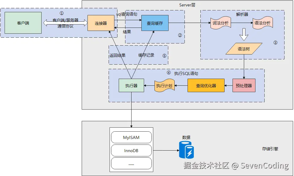 - 服务层 :主要负责 SQL 语句的解析与优化,还包括查询缓存和 MySQL 内置函数的实现。