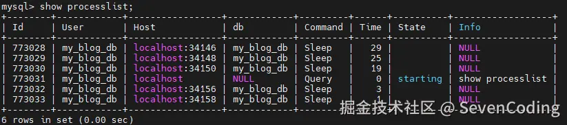 其中"Command"列返回的内容中,"Sleep"表示MySQL相同中对应一个空闲连接。而"Query"表示正在查询的连接。