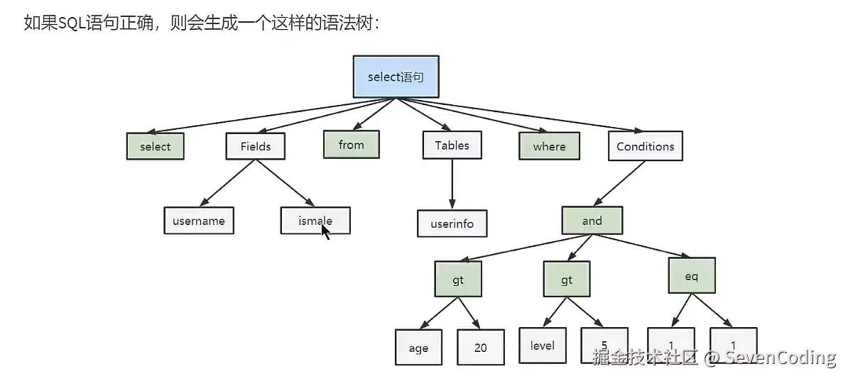 - 语义分析 :语义分析主要是检查 SQL 语句中的每个对象是否符合数据库的实际情况。如表名、字段名 是否存在,用户是否对相关表和列拥有执行权限,数据类型是否匹配等。