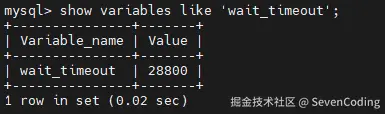 从上图可以看出有许多空闲连接,MySQL 定义了空闲连接的最大空闲时长,由 wait_timeout 参数控制的,默认值是 8 小时(28880秒),如果空闲连接超过了这个时间,连接器就会自动将它断开。