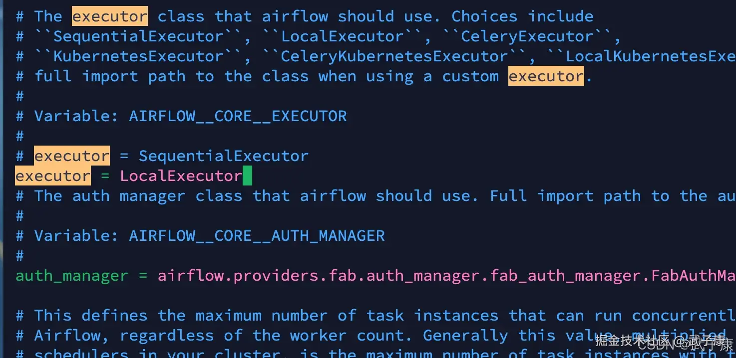 - 执行器的修改:修改 $AIRFLOW_HOME/airflow.cfg 中:executor = LocalExecutor 这里关于执行器的修改,修改如下所示: