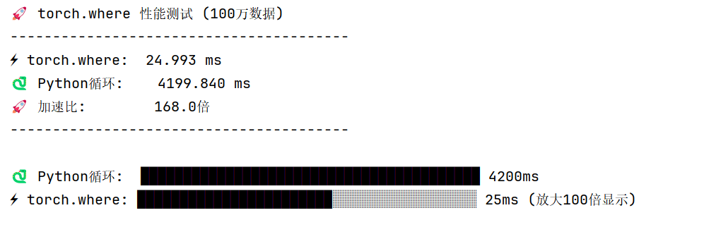 print(f"⚡ torch.where: {'█' * torch_bars_scaled}{'░' * (bars - torch_bars_scaled)} {torch_time:.0f}ms (放大{scale_factor}倍显示)")