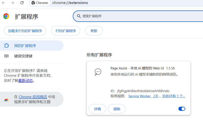 若插件无响应:在 chrome://extensions/ 页面关闭再开启 Page Assist 插件,或重新加载扩展。