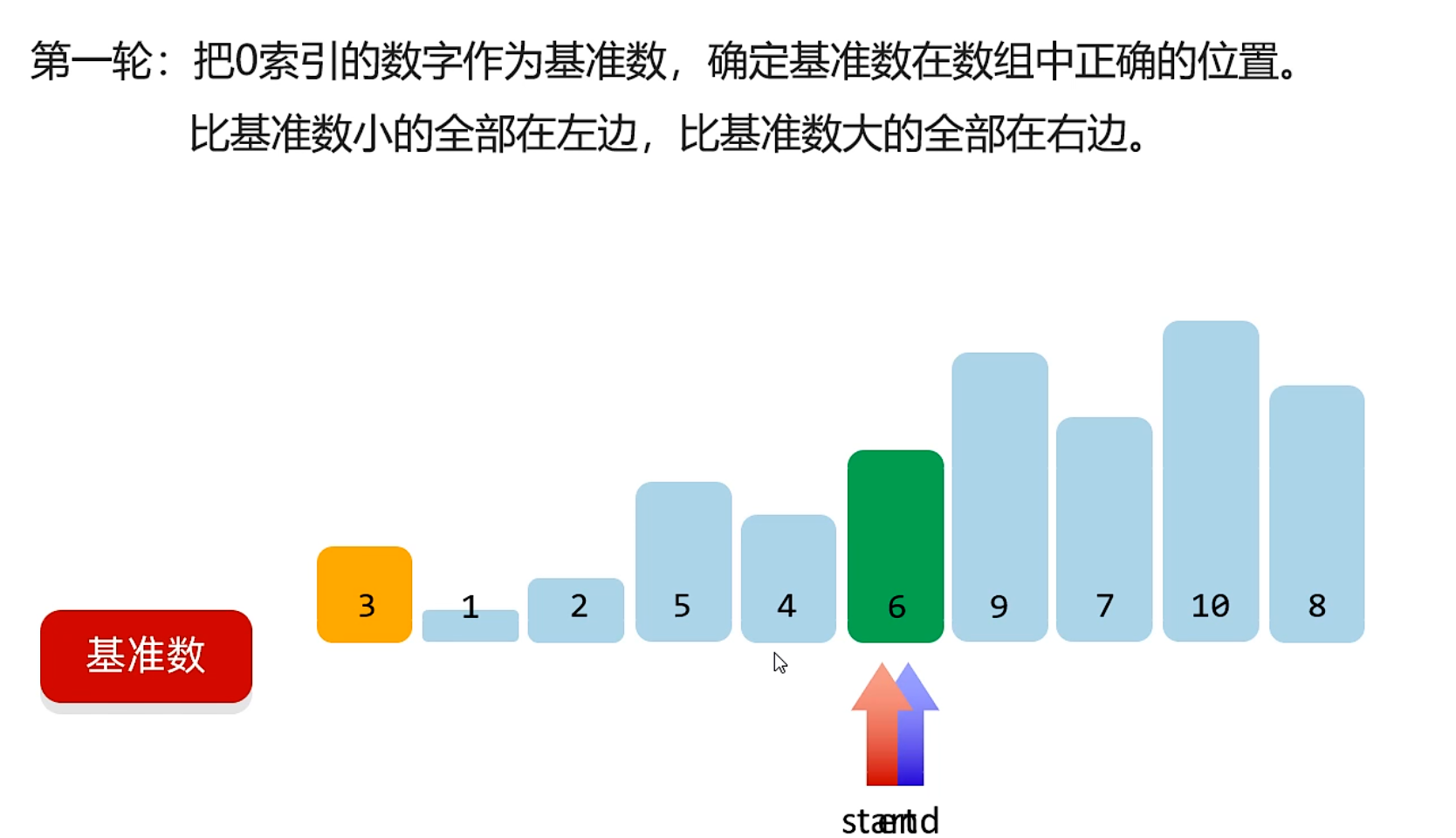 循环内部通过两指针指向数据的交换,来实现,基准数左边的数 < 基准数,基准数右边的数 > 基准数。