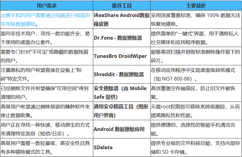 选择合适的安卓数据擦除工具取决于您的具体需求、技术水平和安全要求。对于需要彻底清除数据的专业级工具, iReaShare Android Data Eraser脱颖而出,它可以高效地覆盖所有已删除的数据。同时,Shreddit 和 Secure Eraser 等应用则提供了便捷的设备端解决方案,适合日常使用。希望您能通过这篇安卓数据擦除工具评测找到合适的工具。
